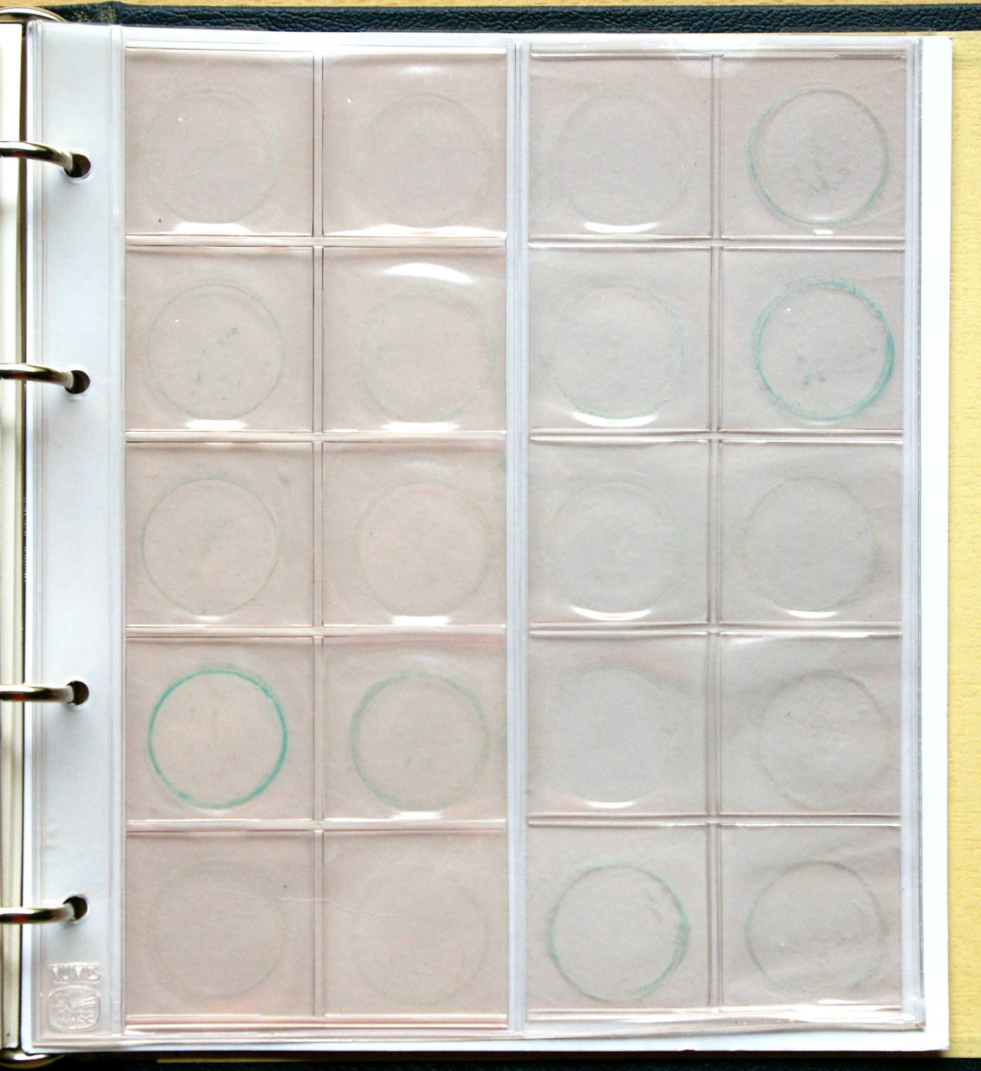 - – 3 įmautės, talpinančios po 16 monetų, kurių vienos kišenėlės monetai dydis 38 x 38 mm.