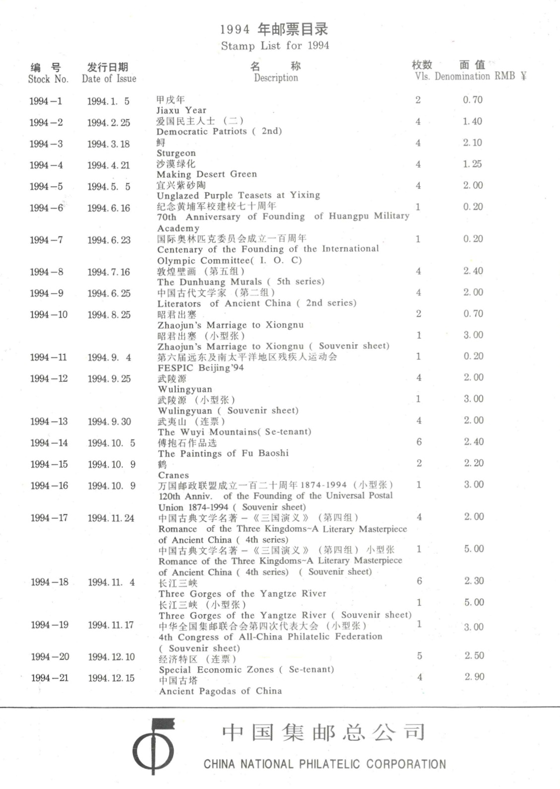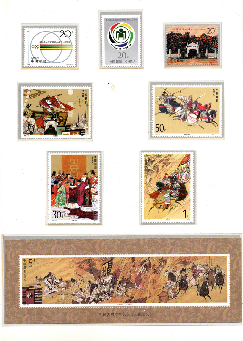Kinija, 1994 m. pašto ženklų kolekcija (MiNr 2515-2586)