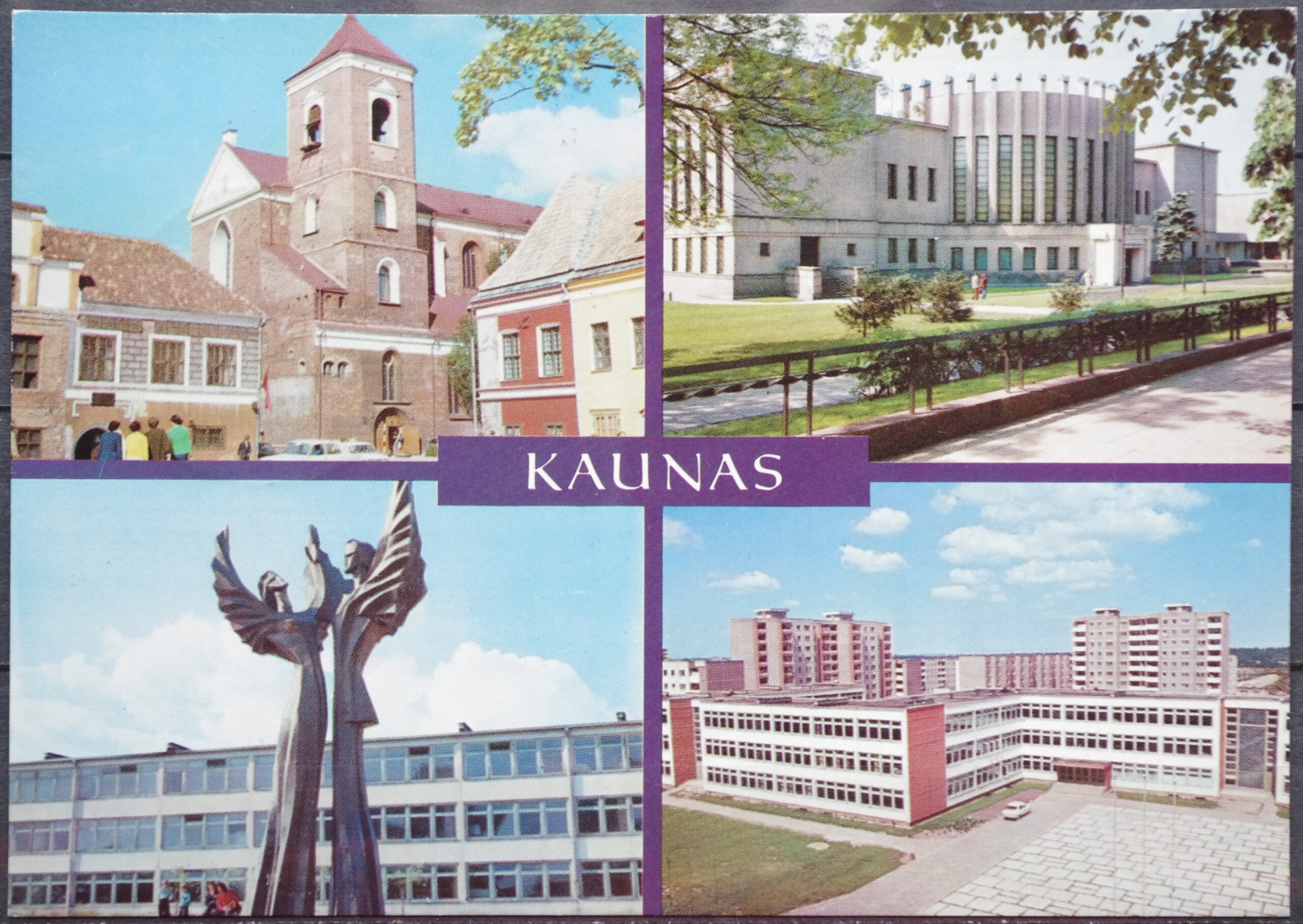 Kaunas: Senamiesčio fragmentas, skulptūra „Jaunystė”, M. K. Čiurlionio dailės muziejus, naujasis mikrorajonas