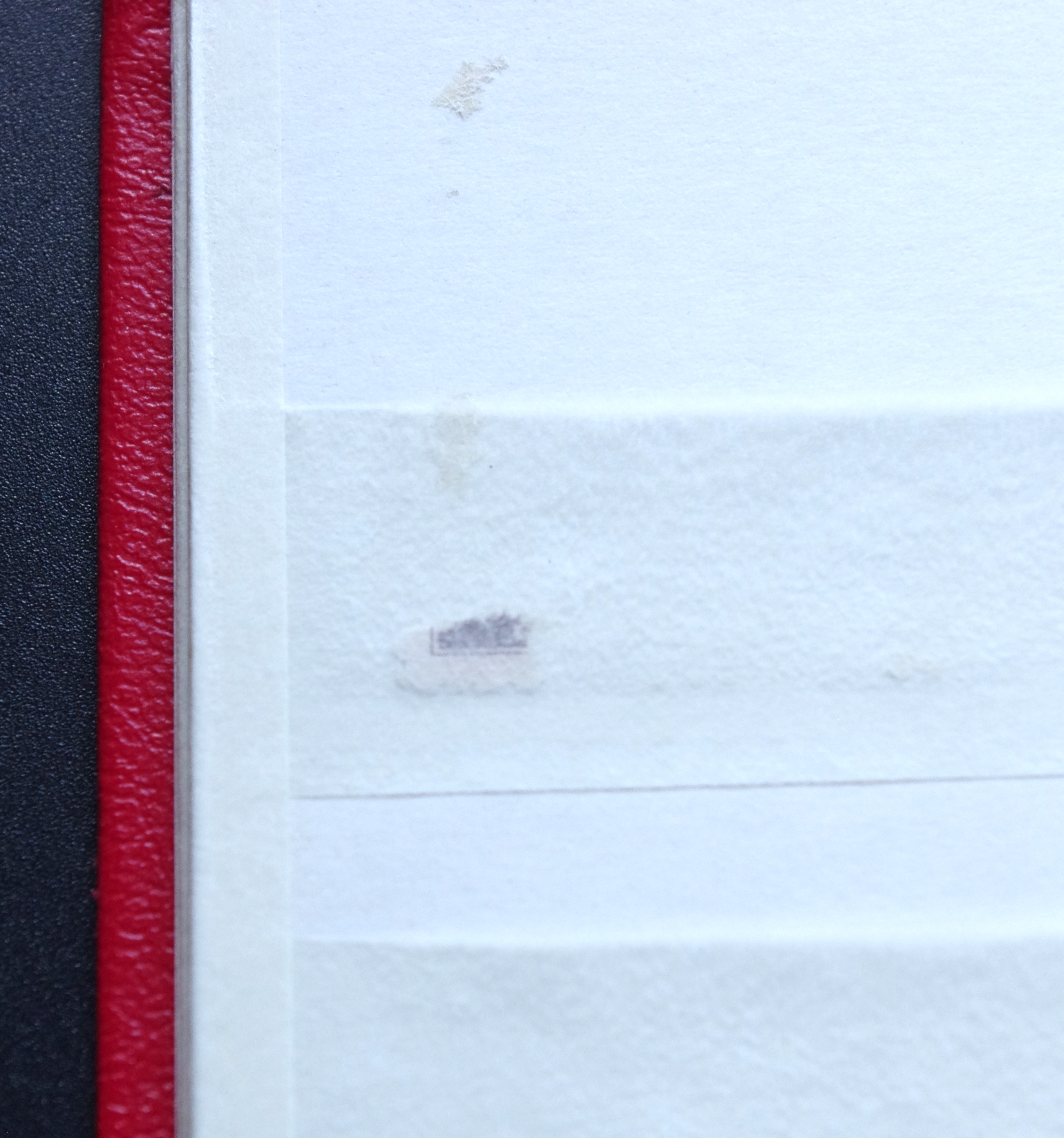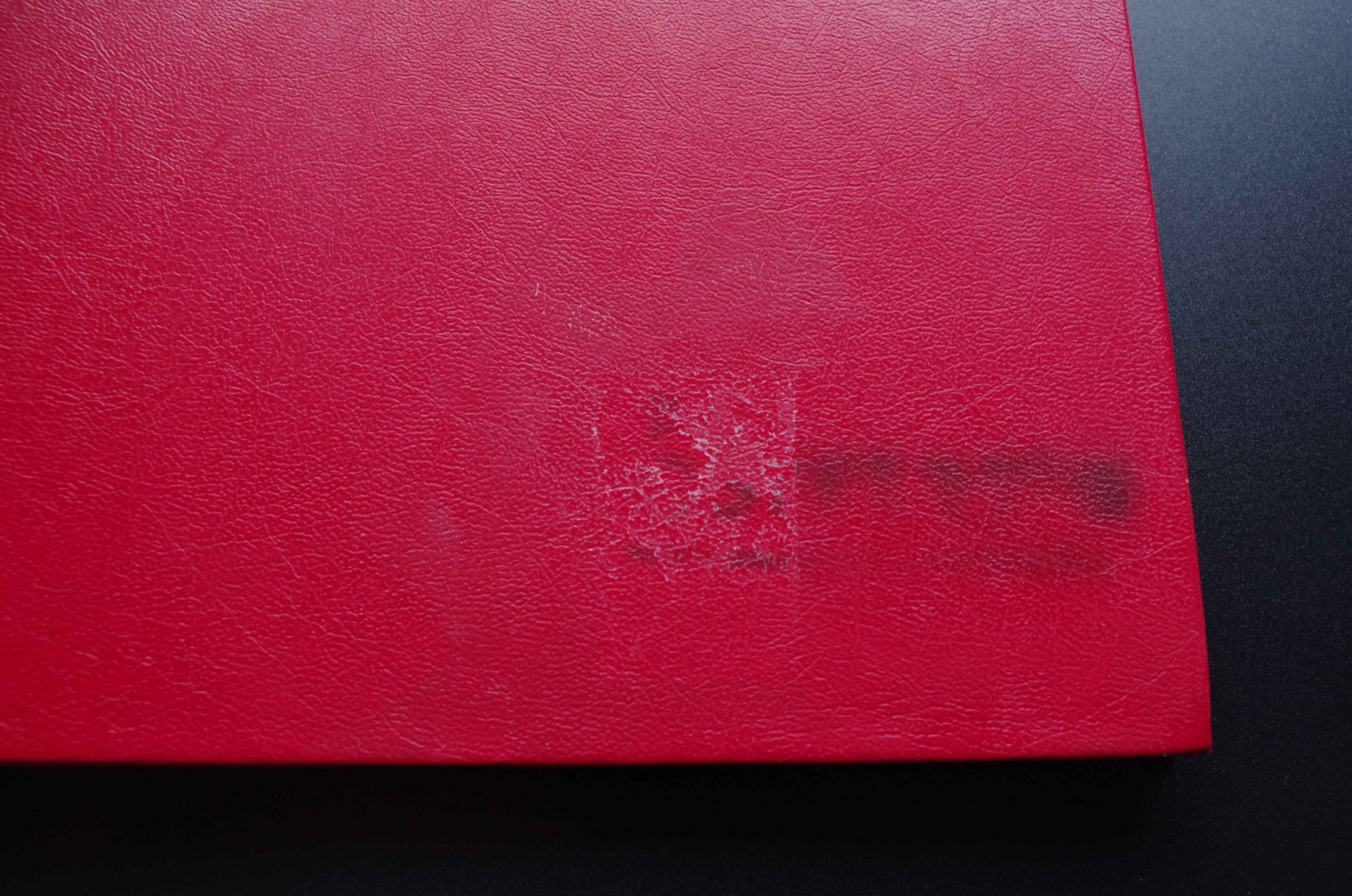 Naudotas, raudonos spalvos albumas pašto ženklams. Labai patogus laikyti dublius, nes puslapiai padalinti į dvi dalis