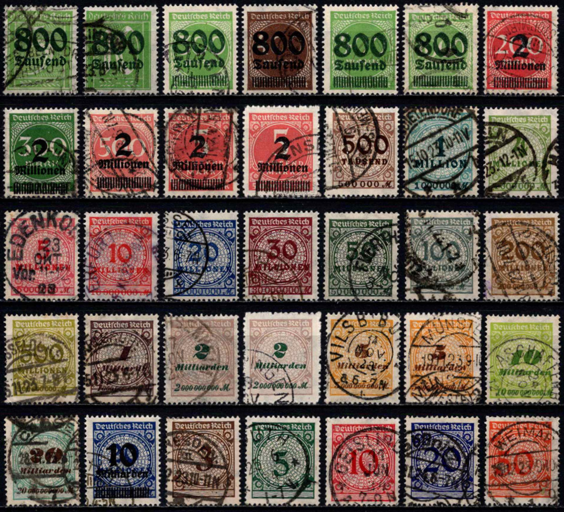 35 vnt. skirtingų infliacinių ženklų rinkinys iš serijų MiNr 301-312, 313-330, 332-337 ir 338-343